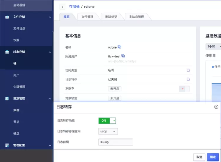 通过开启日志转存功能开关,UCloudStor可自动记录对于Bucket及Bucket下对象的操作访问日志,并存放到指定的存储空间,用于支撑安全分析、合规审计、资源跟踪和问题定位等常见应用场景。