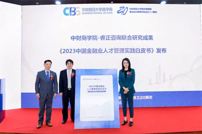 论坛上,同时发布了中财-睿正联合研究《2023中国金融业人才管理实践白皮书—新时代、新逻辑和新人才管理之道》,中财商学院林嵩教授、朱飞教授,睿正咨询谢健乔作为联合研究团队代表,共同揭幕发布。