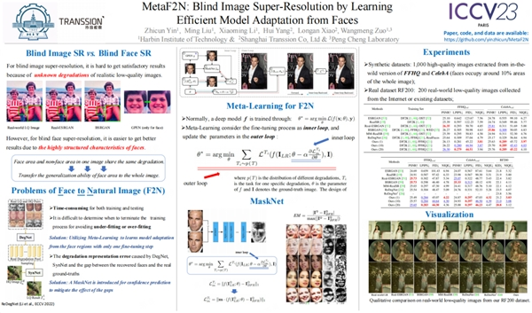 近日,国际计算机视觉大会 ICCV 2023(International Conference on Computer Vision,简称ICCV)在法国巴黎召开。传音影像团队与哈尔滨工业大学机器学习研究中心合作完成的图像超分辨领域的论文“MetaF2N: Blind Image Super-Resolution by Learning Efficient Model Adaptation from Faces”被ICCV 2023接收。该论文为图像复原领域的技术难题提供了新思路,且能应用在智能移动终端产品图像和视频功能上,具有广泛的应用场景。