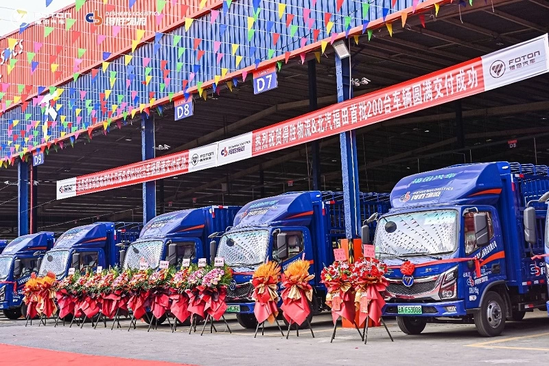 此次交付的新能源物流车为福田汽车新能源明星产品——福田奥铃智蓝HL超混轻卡、福田祥菱V1纯电动微卡。