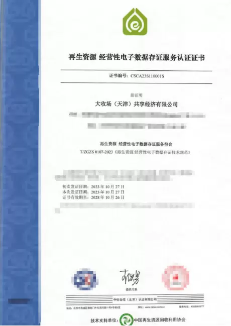 2023年10月27日,天津拾起卖科技集团旗下大收场(天津)共享经济有限公司顺利通过由中国再生资源回收利用协会联合多家研究机构及企业共同制定的《再生资源 经营性电子数据存证技术规范》相关资质认证,取得了第三方颁发的001号再生资源经营性电子数据存证服务认证证书,编号为CSCA23S110001S,成为全国首家再生资源经营性电子数据存证服务认证企业。