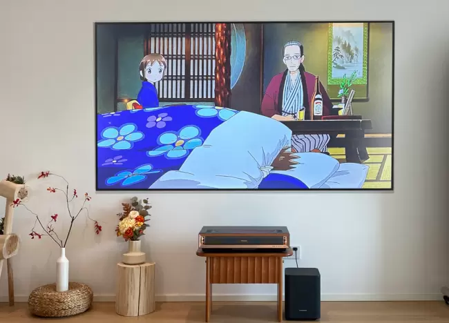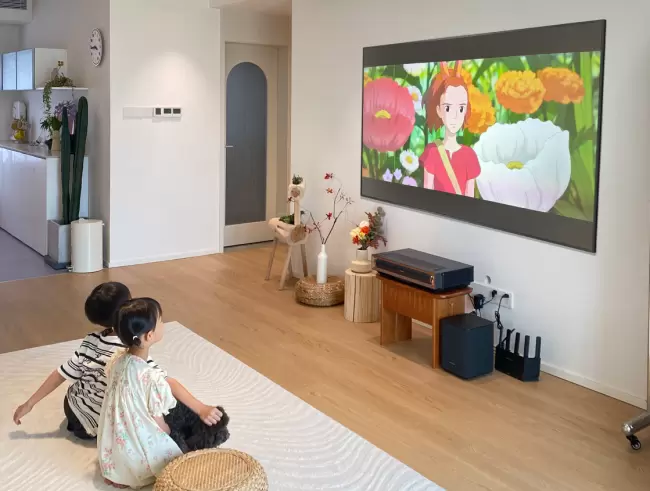 海信激光电视L8K还有一个惊喜点——家居融合。作为一台存在感满满的巨幕电视,更好地与家居环境融为一体是产品的诉求之一。海信激光电视L8K屏幕薄至15mm,厚度接近苹果手机,且因为屏幕不通电,不用担心散热问题,可无缝贴墙安装,轻松融入任何环境。同时,它拥有动态背景、多样时钟、律动音乐、艺术画廊等氛围场景,如同一件精致的展品,尽显主人品味。