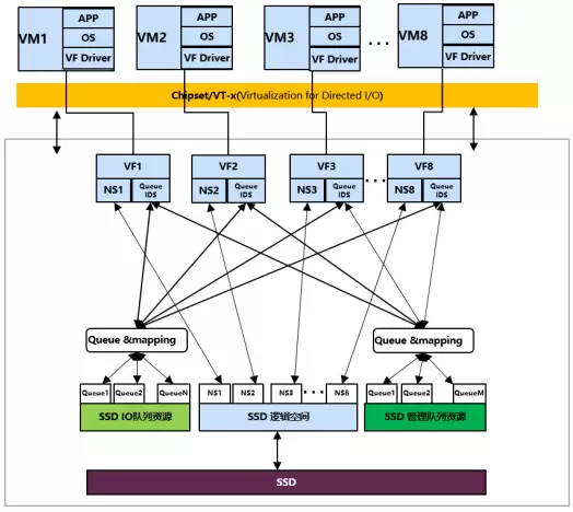 3、各 VF 之间的 IO 业务性能相互隔离,不因某一个 VF 的性能变化而导致其他 VF 性能的波动。
