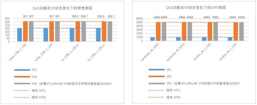 图 3: QoS 功能在 VF 状态变化下的带宽及 IOPS 表现
