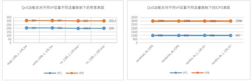 图 2:QoS 功能在对不同 VF 设置不同流量限制下的带宽及 IOPS 表现