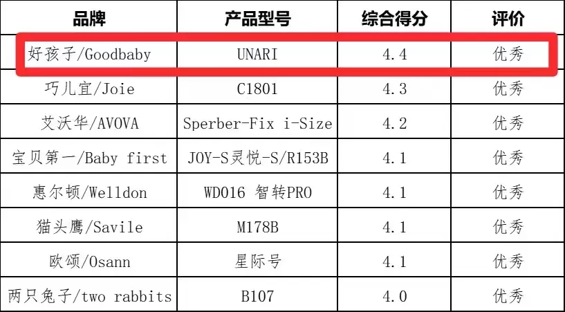 经实验室检测,来自“好孩子”的UNARI产品以4.4分的综合得分位列评分第一,得益于好孩子采用了航天蜂窝铝吸能技术,在受到外力撞击的瞬间吸收能量是普通儿童安全座椅的2.56倍。