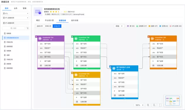 传统的数据资产目录主要集中在结构化数据库表管理。而三维天地的数据目录在此基础上扩展了BI看板、ETL作业、主数据模型等类型,可以展示更多样的数据对象,更细节的血缘关系,更及时的数据特征。
