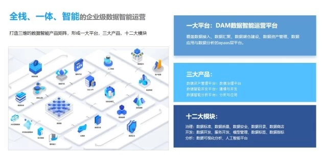 作为全栈、一体、智能的企业级数据智能运营平台,DAM V13形成了一大平台、三大产品、十二大模块的完整产品矩阵。主要包括治理、开发、分析三大产品,涵盖数据目录、数据标准、数据质量、数据安全、数据开发、主数据建模、数据建模、指标建模、标签建模、AI人工智能、BI商业智能、数据超市能等12大模块,支持从数据治理到数据开发到数据分析的全链路的数据资产管理能力。