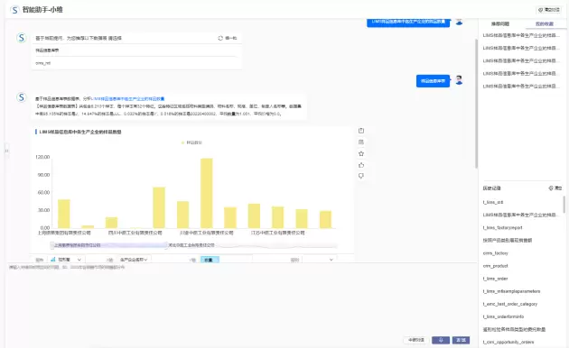 结合新一代技术,基于大模型实现智能数据分析,通过提供问答式的交互来降低操作门槛,基于NL2SQL实现数据的可信、可追溯。同时基于三维天地在检验检测数智化领域的多年深耕与思考,训练了基于LIMS垂直行业的大模型,涵盖食品检测、动植物检测、实验室检测、综合第三方检测、环境检测以及医学监测等各行各业,综合万亿级的实际项目数据和千余条行业指标,打造出一款基于LIMS领域的ChatBI应用。