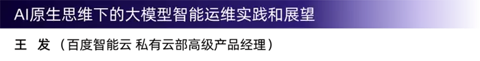 百度智能云私有云部高级产品经理王发,分享《AI原生思维下的大模型智能运维实践和展望》。演讲阐述了在前沿技术视角下,对于大模型和AIOps领域的探索和展望。