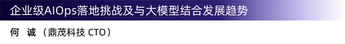 围绕这些挑战和解题思路,鼎茂科技CTO 何诚,分享了《企业级AIOps落地挑战及与大模型结合发展趋势》。演讲主要围绕企业级AIOps端到端智能化解决方案落地的问题和挑战,提出了技术和解决方案应对思路。同时对AI大模型技术在智能运维领域的落地探索以及未来发展趋势进行了分享。