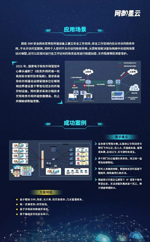 本次所展示的场景化案例是网御星云基于某单位电子政务场景设计的定制化方案。该方案基于用户业务帐号管理分散、缺乏统一监管及权限管控、人员审计排查难度大等多个需求痛点,利用超级SIM安全网关在终端设备上建立了安全工作空间。安全工作空间内仅允许访问政务外网,不允许访问互联网,同时个人空间不允许访问政务外网,从而有效解决复杂网络中的双网隔离访问难题,对运行在工作空间的政务应用进行数据加密、文件隔离等防泄密保护。
