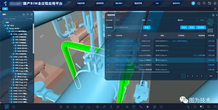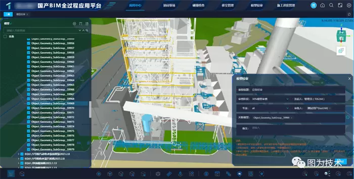 基于多源数据融合技术、数据轻量化技术、三维可视化技术,图为技术结合发电工程需求,助力国家能源集团研发了国产BIM全过程应用平台。该平台依据发电工程国产BIM标准体系,可无损加载发电工程国产BIM基础建模软件输出成果,实现了“一套数据,一套模型,一个业务平台”的全过程生命周期数字化管理。
