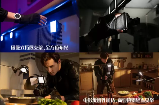 与专业COB影视灯相比,口袋灯和棒灯控光配件选择较少,摄影师需定制DIY附件。为解决口袋灯拓展难题,智云五倍M20系列将电影拍摄中的控光、塑光、聚光需求移植进入口袋灯使用,定制了全套电影级附件,通过拓展支架的磁吸功能,可能分别或叠加使用四叶挡光片、蜂巢格栅、柔光片。即便在户外拍摄和极限空间场景依旧能使用专业光效创作,解决口袋灯无法拍出电影感难题。