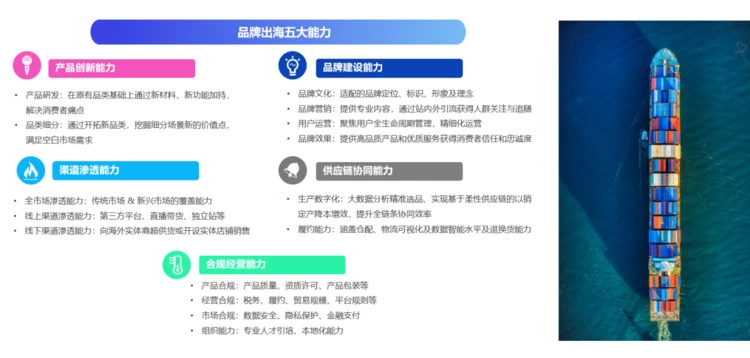 当下海外消费需求的日益多元化,越来越多的产业带出海商家开始注重差异化竞争定位及价值主张,积极拥抱品牌出海,逐步从原有的生产制造环节向研发、设计、品牌营销、供应链等领域延伸。报告从产品创新能力、品牌建设能力、渠道渗透能力、供应链协同能力及合规经营五大能力详细阐述,为产业带商家解锁如何构筑品牌护城河,向价值链高端跃迁的底层密码。