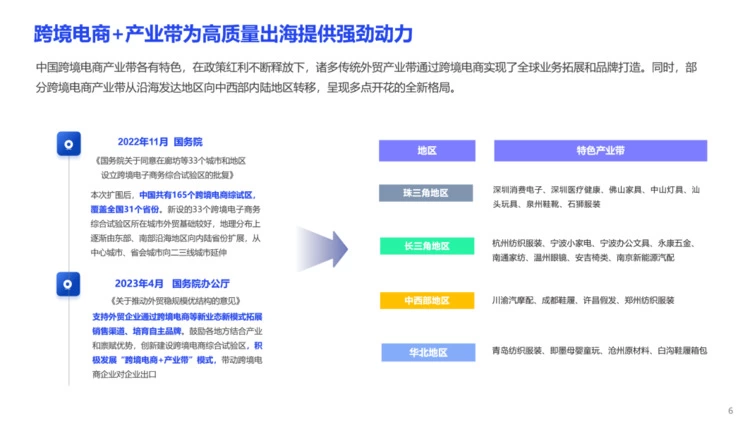 当下,我国产业带出海已从粗放式高速增长迈入精耕细作的品牌出海新阶段。在国家支持外贸新业态发展背景下,诸多传统外贸产业带依托跨境电商渠道和数字化服务工具积极转型,聚焦品牌打造及全球化发展。同时,部分跨境电商产业带从沿海发达地区向中西部内陆地区转移,呈现多点开花的全新格局。