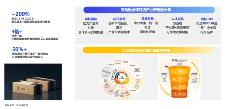 工欲善其事,必先利其器。产品带品牌出海要充分利用好跨境电商渠道提供的品牌扶持政策、相关数据、工具、技术及服务,联动相关资源提升海外市场的销售额和市场份额,通过全球化布局抢占价值高地,持续增强品牌知名度和影响力。如亚马逊全球开店发布的“产业带启航十条”,从商机拓展、品牌打造、本地化服务、人才培育和品牌标杆塑造五个方面推动“跨境电商+产业带”融合发展,帮助商家积累面向未来的综合能力。此外,2023年亚马逊全新升级品牌运营地图,推出六大模块覆盖在海外打造品牌的全周期打法,以新工具领航为品牌出海注入强劲动力。