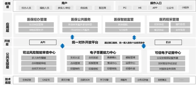 法大大以数智一体化能力作为公共支撑,提供医疗保障可信数智签约方式,应用在医保经办管理、医保公共服务、医保智能监管、医药招采管理四大场景。