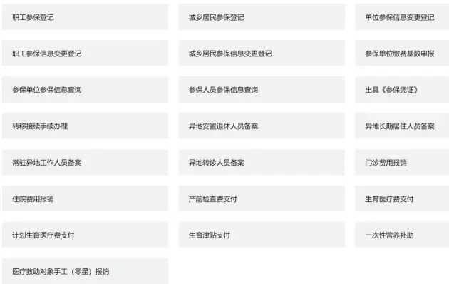 参保和变更登记、个人账户一次性支取、保险关系转移接续、参保人员异地就医备案等。
