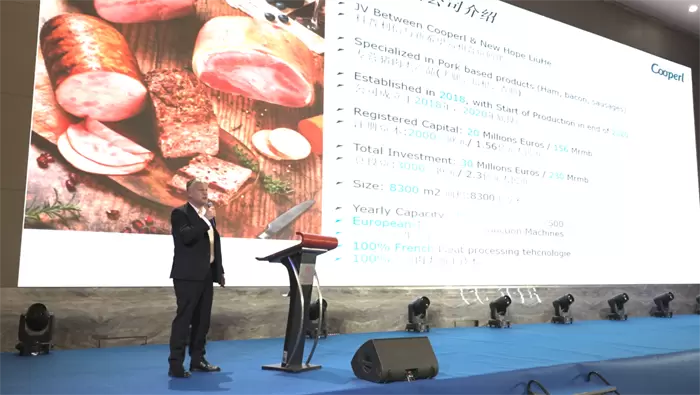 美好美得灵食品有限公司总经理Thomas GAUDEAU介绍了科普利信与新希望六和中法合资专营猪肉类产品的合作,包括火腿、培根和香肠等产品,为消费者提供更多美味和高质量的选择。