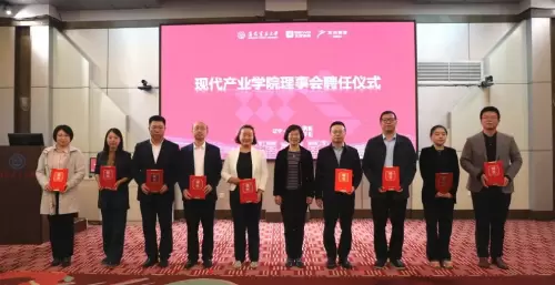 严文复为现代产业学院理事会成员及管理层颁发聘书。于立国任理事长兼产业学院院长、马韵桐任副理事长、冀广鹏任理事兼产业学院副院长、张一兰任理事、李大伟任产业学院副院长。