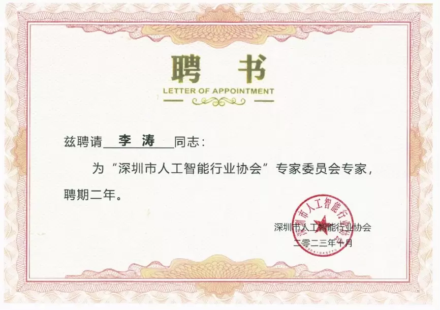李涛受聘为深圳市人工智能行业协会专家委员会专家