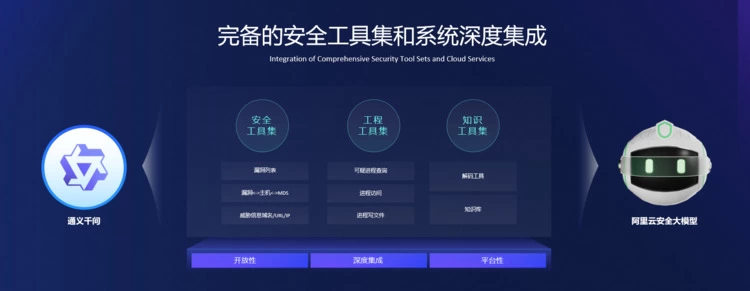 阿里云安全大模型能快速落地得益于完备的工具集,工具集的API接口是通用大模型和安全大模型之间的桥梁。威胁工具集、工程工具集、知识工具集联动通用大模型和安全大模型,更高效进行威胁分析处置,以离线计算、实时计算、图计算等多种计算形态,满足不同场景需求。