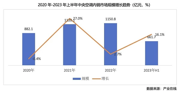 回顾近几年中央空调市场的发展情况,三年疫情影响下,对于基础建设、物流、生产等各方面的影响,使得中央空调市场经历了比较大的震荡,发展节奏显著波动。2023上半年,中央空调行业生产端较快恢复,实现高预期增长。产业在线数据显示,内销市场在消费边际改善、工业生产稳步恢复、服务业景气修复等宏观经济回暖以及低基数效应的共同带动下,实现了16.10%的同比增长。