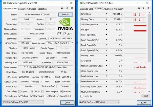 首先是检测软件GPU-Z可看到影驰 20周年GeForce RTX 4090的产品规格和基本参数,以及其待机温度为 40.5°C,功耗为24.6W。