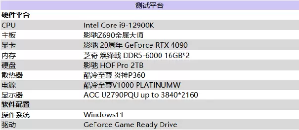 正式进入测试环节,本次测试平台处理器采用Intel Core i9-12900k,搭配影驰Z690金属大师主板,内存采用芝奇幻锋戟 DDR5 6000Hz 16GB*2;固态采用的是 影驰 Hof Pro 2TB。PCIe4.0 固态的超高读写速度搭配超高性能的配置让影驰 20周年GeForce RTX 4090的出彩性能在测试中完美呈现出来。