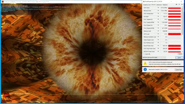 FurMark测试所提供的是显卡 GPU的功耗控制能力。开启FurMark后,需要经过一段时间等待温度与功耗数据稳定,最终所获得的结果即是影驰 20周年GeForce RTX 4090 GPU的功耗。数值为445.3W,温度为71.5℃。在满载功耗的情况下,影驰 20周年GeForce RTX 4090的温度依旧能保持在一个稳定的情况,该卡所设计的全新散热系统可谓是非常优异了。需要注意的是,该卡在满载时所需要的功耗达到445.3W,这里建议各位玩家和创作者们电源上的选择是使用功率为850W以上的电源设备。