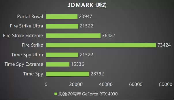 通过数据可以得到,在3DMark TimeSpy DX12 测试,影驰 20周年GeForce RTX 4090的显卡分数达到了28792分。在3DMark Fire Strike DX11测试中,影驰 20周年GeForce RTX 4090 的显卡分数为73424分。Fire Strike DX11测试的分数说明了,影驰 20周年GeForce RTX 4090在4K分辨率下,也可以让玩家们体验到流畅运行市面上的所有游戏,超高的性能让玩家们实现高刷新率的需求。最后一项测试是3DMark Portal Royal光追测试,影驰 20周年GeForce RTX 4090也持续稳定发挥,分数达到了20947的高分。即便是在4K分辨率下的光追游戏大作,该卡也可以凭借着强悍的性能流畅运行。