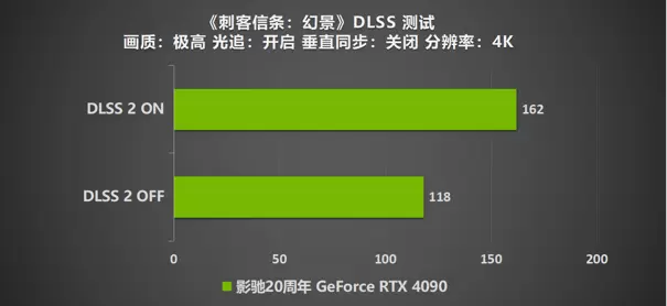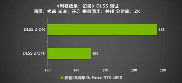 影驰20周年 GeForce RTX 4090 在进行《刺客信条:幻景》时,可谓是毫无压力可言。即便是未开启NVIDIA DLSS 技术时,帧数也能高达165帧。而通过DLSS 2模式的加持,帧数也进行了一定的涨幅,达到了188帧。让玩家们的整体游戏体验更加的流畅稳定。