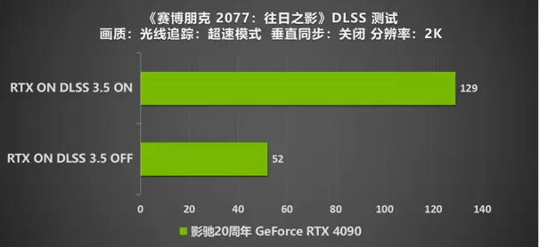 在2K分辨率下的影驰20周年 GeForce RTX 4090 凭借着自身的性能,在《赛博朋克2077: 往日之影》中开启"光线追踪:超速模式"也依旧可以达到52帧的成绩。玩家们在进行游戏时开启该模式,所获得的的游戏画面将会更趋近于真实,享受更加震撼的画面细节,但与此同时也将对于显卡拥有着巨大的压力。通过NVIDIA DLSS 3.5的加持,帧数进行了翻倍的增长,高达129帧。让玩家实现全景光线追踪下的高帧流畅游戏体验。