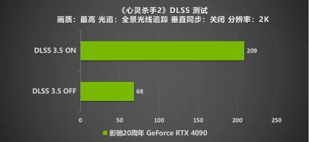 影驰20周年 GeForce RTX 4090 在2K分辨率下游玩《心灵杀手2》时的帧率可以达到68帧,可以说是一个流畅运行的程度。想要享受更高帧率的玩家,则可以开启NVIDIA DLSS 3.5模式,帧数上涨了惊人的307%,达到了209帧。