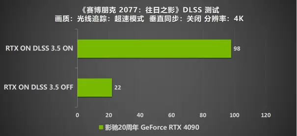 4K分辨下的影驰20周年 GeForce RTX 4090 也只能跑到35帧的成绩,由此可见该游戏的盛大以及对于显卡超高的要求。搭配开启NVIDIA DLSS 3.5技术后,帧数可以达到136帧的好成绩。
