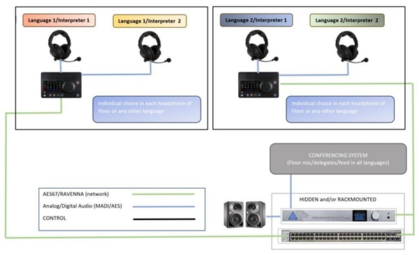 所有Anubis均通过网络互联互通(AES67/ST2110),因此每个音频流在任一Anubis上均可用。Hapi Mk II(AD/DA、Madi、AES/EBU转换器)拥有所有标准格式,作为输入/输出点连接到现有的控制台、PA或会议系统。这种口译解决方案的一个主要优点是,它能通过VPN和每个Anubis的IP地址进行远程控制。
