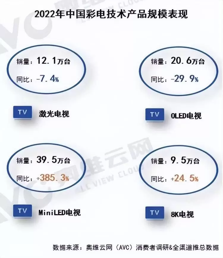 目前市面上主流的电视显示技术为Mini LED和OLED。在价格、亮度和使用寿命上,Mini LED相较于OLED都有着明显的优势。Mini LED采用体积更小的背光灯珠提供更精密的背光源,实现了分区背光控制能力的跃升,同时也规避了OLED成本高昂、有烧屏风险以及亮度低的缺点。Mini LED既具有与OLED匹敌的点控光优势,又具有OLED所缺失的亮度高和寿命长的优势。因此,Mini LED逐步受到大众和市场的关注和追捧。根据第三方调研数据显示, 2022年,Mini LED电视在中国市场销量同比2021年增长385.3%。这样的增长速率,使得各大厂商不断在Mini LED领域加码投入。
