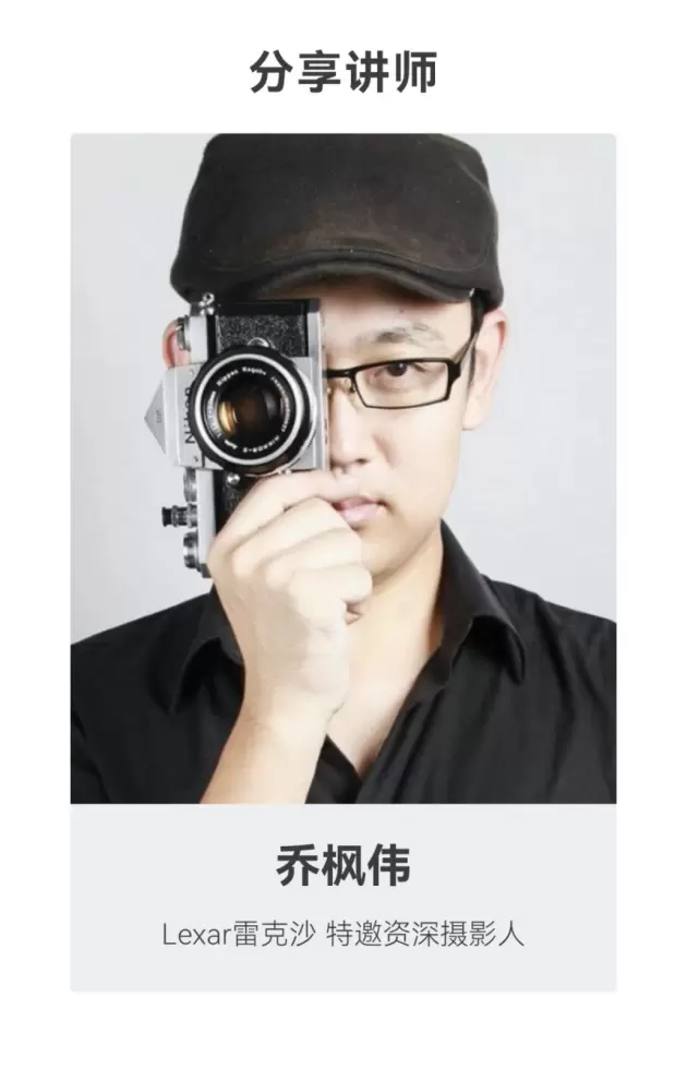 在本次影像创作分享会上,Lexar雷克沙邀请到了资深摄影人乔枫伟老师给大家分享他的摄影历程及创作感想,让大家和专业摄影人近距离交流。据悉,乔枫伟从事影像行业10余年,曾任《影像视觉》编辑部主任,与人民邮电出版社合作推出了后期著作《ACR数码摄影后期处理完全解析》,两度应Adobe官方邀请参加美国Adobe MAX大会。可以说,由乔枫伟老师来和大家分享影像创作知识再完美不过。