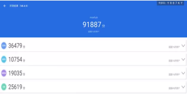 为了更直观比较二者性能差别,我们分别针对皓丽企业版和maxhub V6新锐版进行了安兔兔专业的跑分测试。测试结果如下: