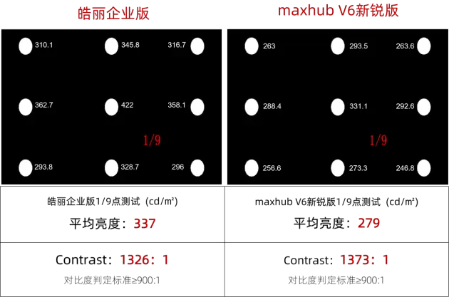 皓丽企业版实测对比度为1326:1;maxhub V6新锐版实测对比度为1373:1。