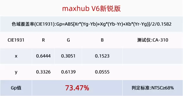 皓丽企业版的色域实测为NTSC76.02%,maxhub V6新锐版是色域实测为NTSC73.47%,皓丽企业版的色域高于maxhub V6新锐版,但两者基本属于同一水平,同样满足消费者的使用需求。