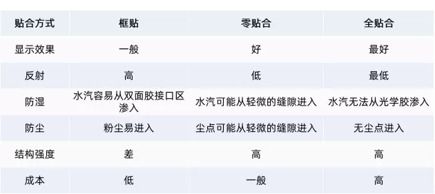 零贴合:介于框贴和全贴合两者之间,主要是在TP和显示屏之间填充折射系数与玻璃相当的非胶性透明介质。一方面让玻璃和显示屏之间没有间隙,减少了漫反射,提升了显示效果;另一方面因为其没有黏性,故组装和维护非常简单,综合成本较低。