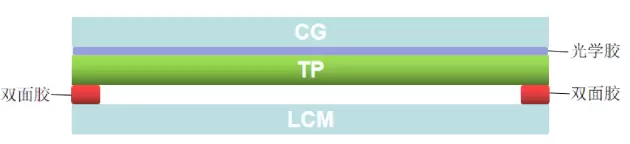从贴合技术上看,目前触摸屏的贴合技术分为三种:框贴(基础款)、零贴合(专业款)、全贴合(高级款),显示效果以此递增。框贴:触摸屏与显示屏之间使用双面胶将四边固定,如下图,框贴的技术难度低、成本低。由于使用双面胶粘合的显示屏和触摸屏之间存在空气层,该空气层会在光线折射后导致显示效果大打折扣。