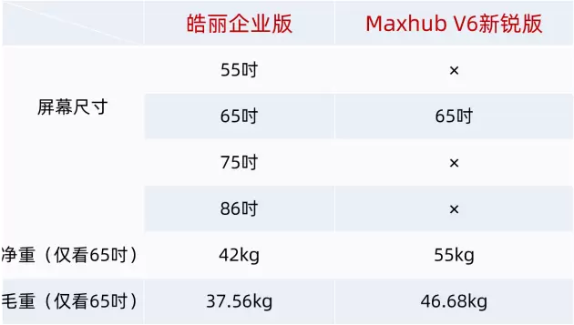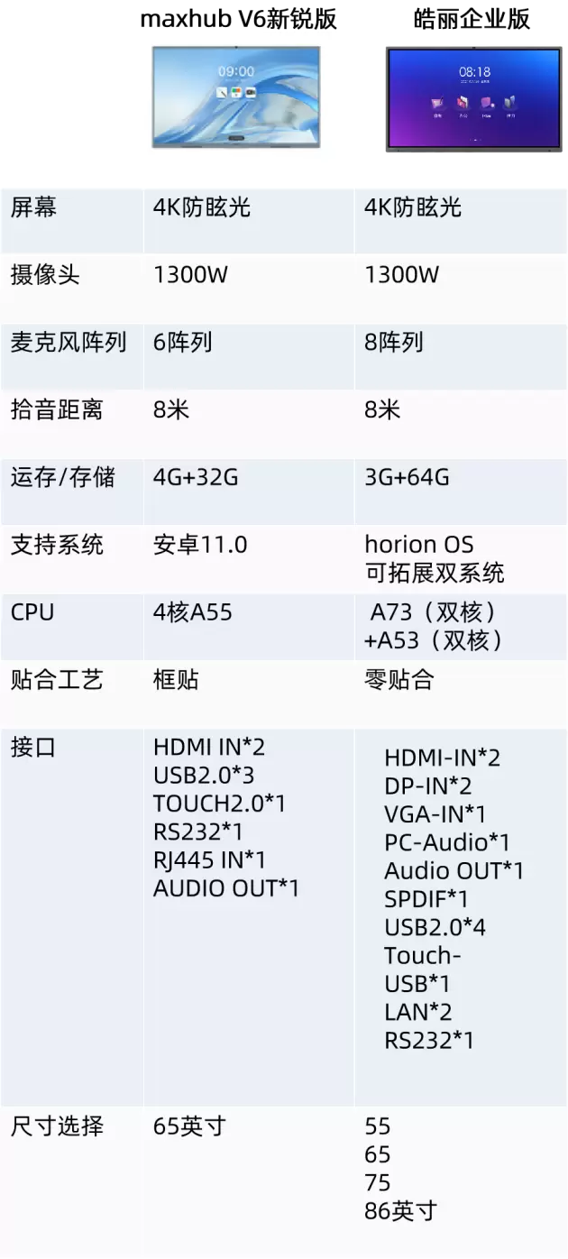 (2)皓丽企业版、maxhub V6新锐版基本参数: