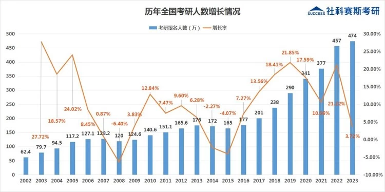 考研人数在近些年保持了飞速增长的趋势,2023年出现放缓的趋势,但人数也是达到了史无前例的474万人。据社科赛斯考研CEO李发进预测:“2024级考研报名人数应该很难再出现前几年那么大幅度的增长,虽然增长幅度会放缓,但是人数还是会增加的。”