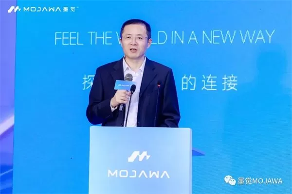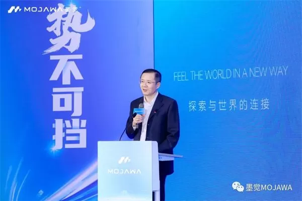 盛会启幕,公司创始人曹洪斌先生开场致辞,他表达了对全场领导及来宾的热烈欢迎。他围绕创业史、核心技术、业务发展情况三大板块来全面解析墨觉品牌。回顾了墨觉从0到1的发展历程,产品研发团队以“帮助用户探索世界,建立连接”为宗旨,现已推出三代骨传导耳机。