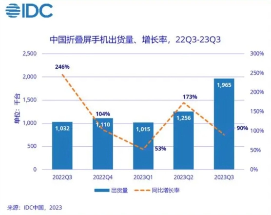 折叠屏手机延续高速增长的趋势,IDC统计的数据显示,今年第三季度的出货量达到196万台,同比增长90.4%。如今,市面上可供消费者选择的折叠屏手机越来越多,产品迭代速度也在加快,折叠屏手机赛道正在迎来最为激烈的市场竞争。
