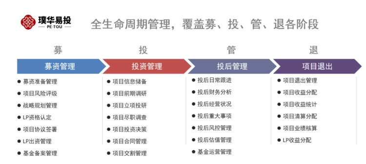 璞华易投作为璞华科技自主研发的一款股权投资平台,主要管理包括母基金、政府引导基金、政府投资基金、股权投资基金等在内的基金类型,围绕基金和项目两大中心数据库,实现股权投资募、投、管、退的全流程管理,支持各种可视化图谱展示统计分析图表,已经成为股权投资管理领域的领军力量。