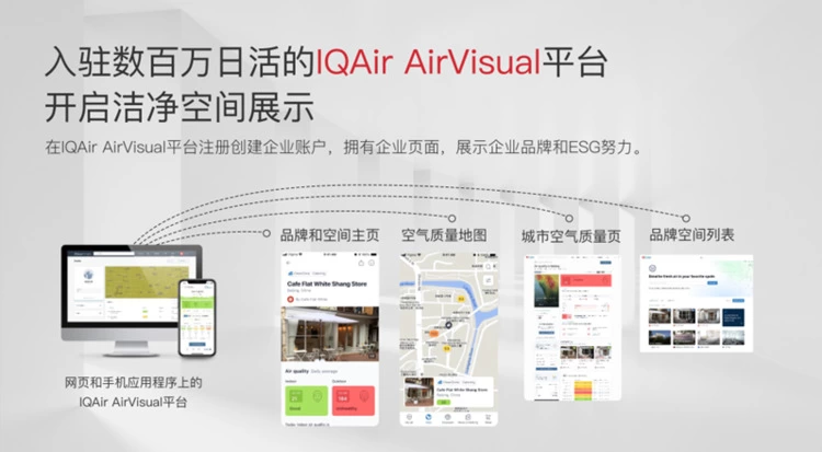 商家还可以入驻数百万日活的AirVisual平台,通过“洁净呼吸空间”计划,实现空气质量数据网络端和移动端同步展示。
